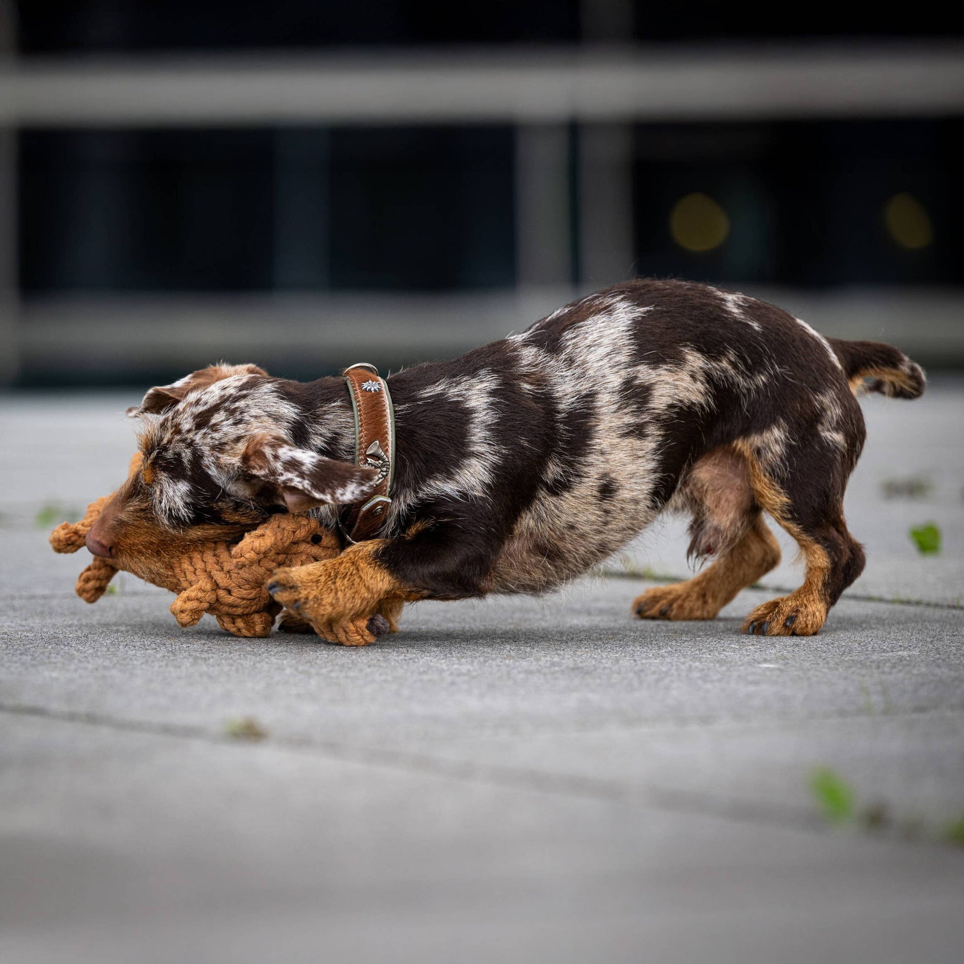 DIEGO DACKEL ist ein wahrer Dandy unter den Kauspielzeugen – charmant, charakterstark und unwiderstehlich für Hunde wie Halter. Sein Design ist eine stilvolle Hommage an die klassischen Merkmale des Dackels: ein langgestreckter Körper, kurze Beine und eine markante Silhouette mit hohem Wiedererkennungswert. Dank seiner ergonomischen Form liegt Diego angenehm in der Schnauze und eignet sich ideal für Kau-, Wurf- und Apportierspiele. Die lange Schnauze mit der charakteristischen Stupsnase sowie die überlangen Ohren laden zum ausgiebigen Kauen ein und sorgen für abwechslungsreiche Spielmomente. Kauen erlaubt – spielerische Zahnpflege inklusive